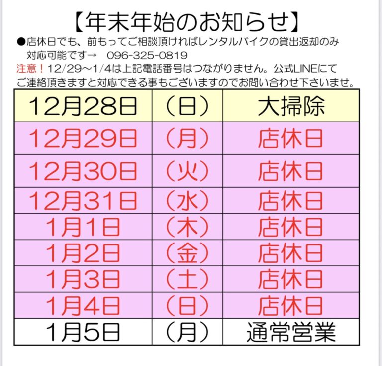 今年もあっという間に年末。。。時間の流れが恐ろしいほど早く感じます12月29(月)~1月4日(日)まで